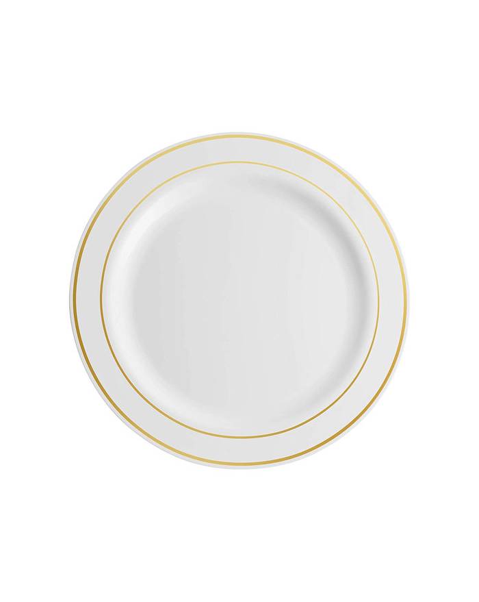 Pack of 100 recyclable white plastic plate with gold bands. Premium heavy duty 7.50 inches elegant and fancy disposable dinner plates. Perfect for Weddings, parties, reception and much more.