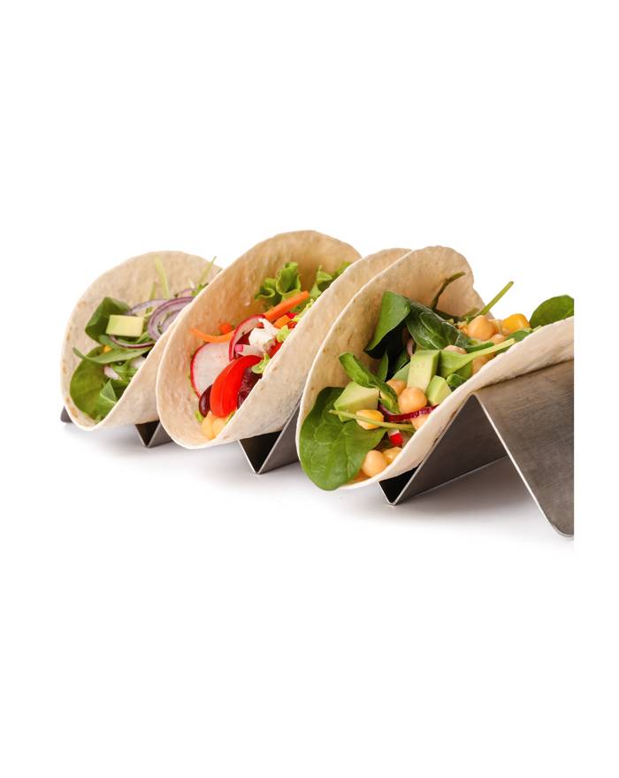 What a better way to display tacos? we have the solution. This modern style taco holder will enhance your customers's dining experience. This cute taco holder will keep your tacos upright and avoir creating mess on the plate and table. Made from high quality stainless steel, this holder is reversible and allow you to use it for 1 or 2 tacos.