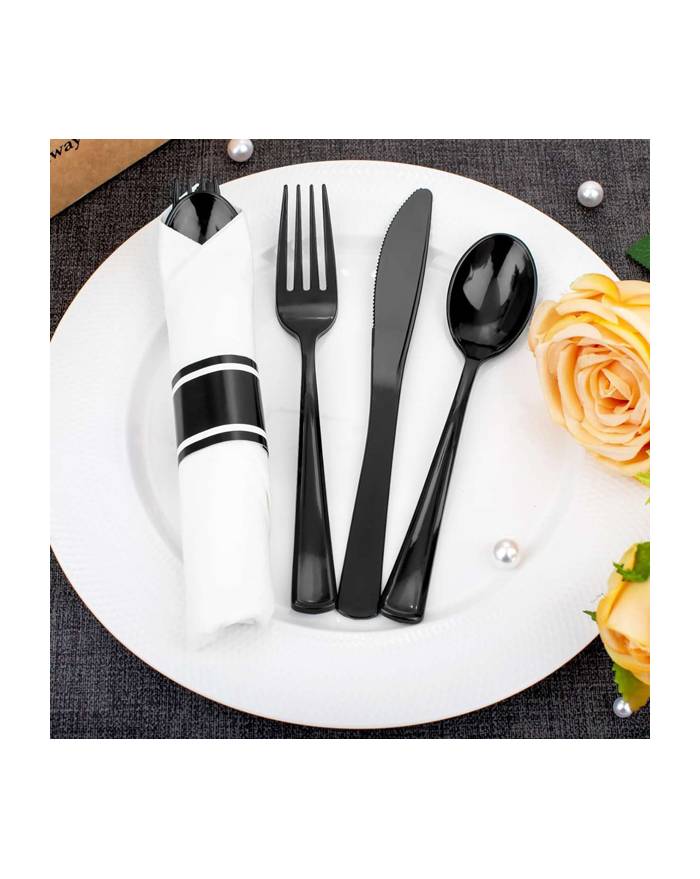 White Pre-Rolled Napkin and Black Heavy Weight Plastic Cutlery Set. white linen-feel napkin rolled around set of black, heavy weight plastic cutlery. The ready to use set comes with a knife, fork, and spoon. Made from premium heavy duty recyclable plastic, this pre rolled cutlery set is ready to use and will save you time and labor setting up.